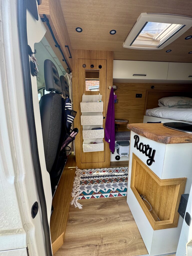 Finally, I wanted to make sure Roxy felt homely and private. I installed a curtain rail to separate the cab, added a blackout curtain, and found the perfect roller blind for the side door. A cosy rug, soft cushions, and a warm blanket brought that extra bit of comfort and personality — simple touches that make a big difference when you’re living on wheels.