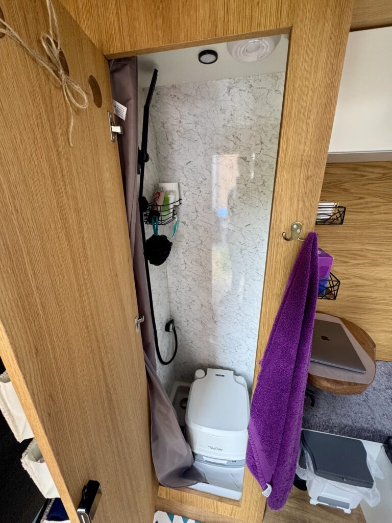 First up: the essentials. Although Roxy came with a proper shower room, there was no toilet — so that was an easy one to tick off my list. I’d asked the seller to fit a 12V socket in the storage under the bench so I could add a portable fridge, so that was another quick win.