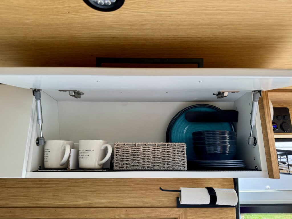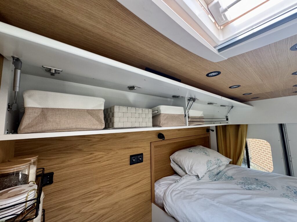 Then came the real puzzle: storage. There are loads of clever compartments throughout the van, but making them work for everyday life on the road meant finding smart ways to organise things. I stocked up on hanging organisers, cargo nets, baskets, food containers, and shelving — and carefully mapped out what would go where.