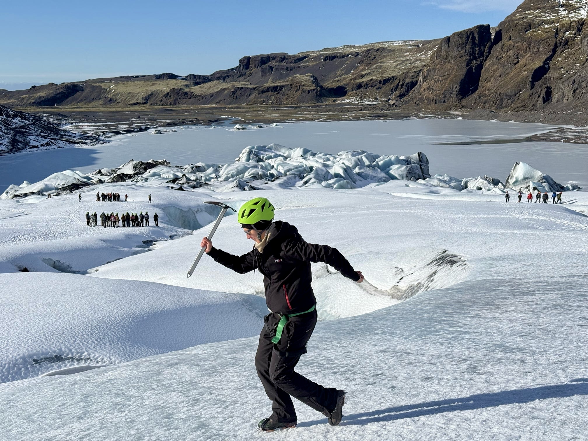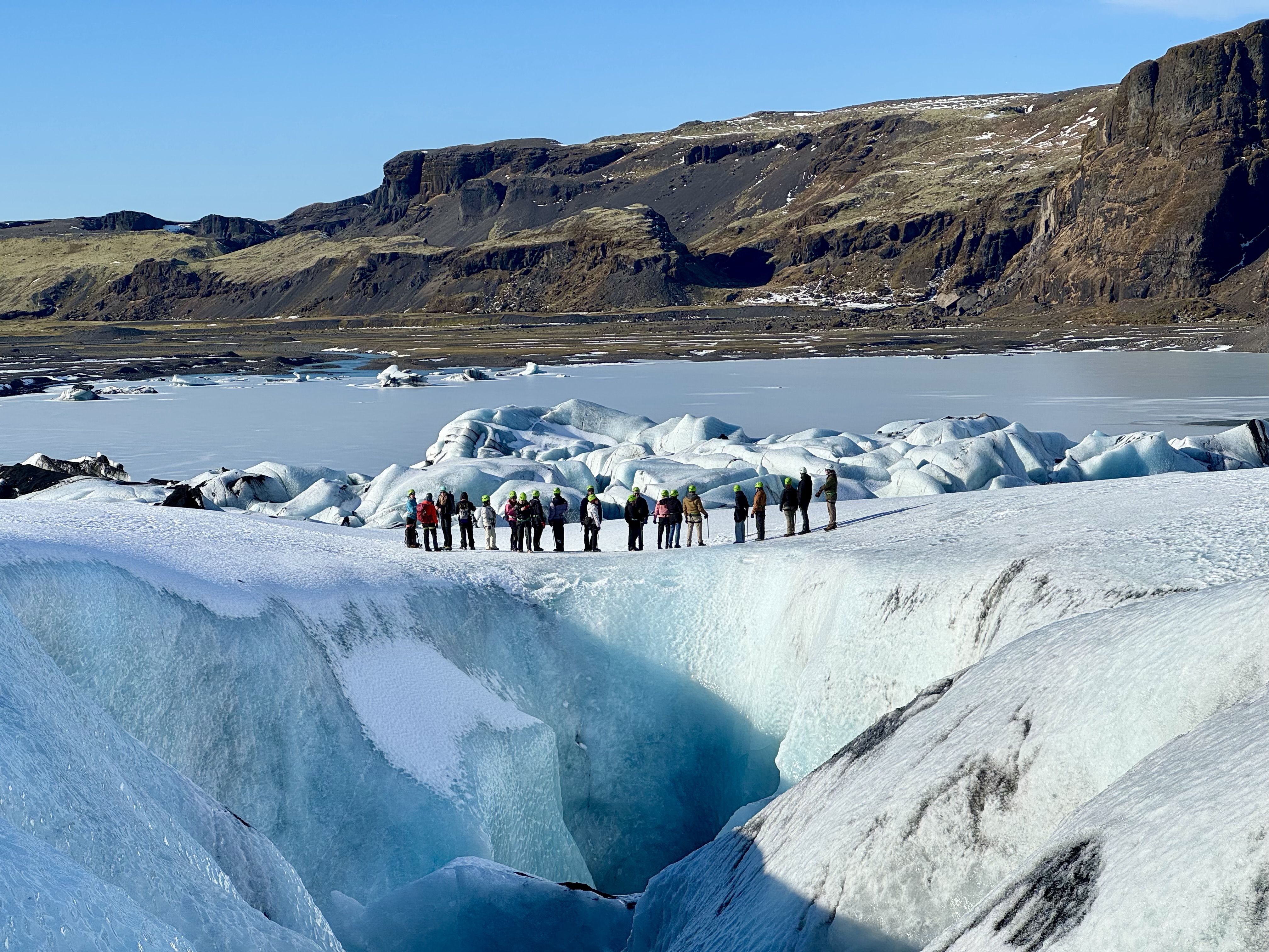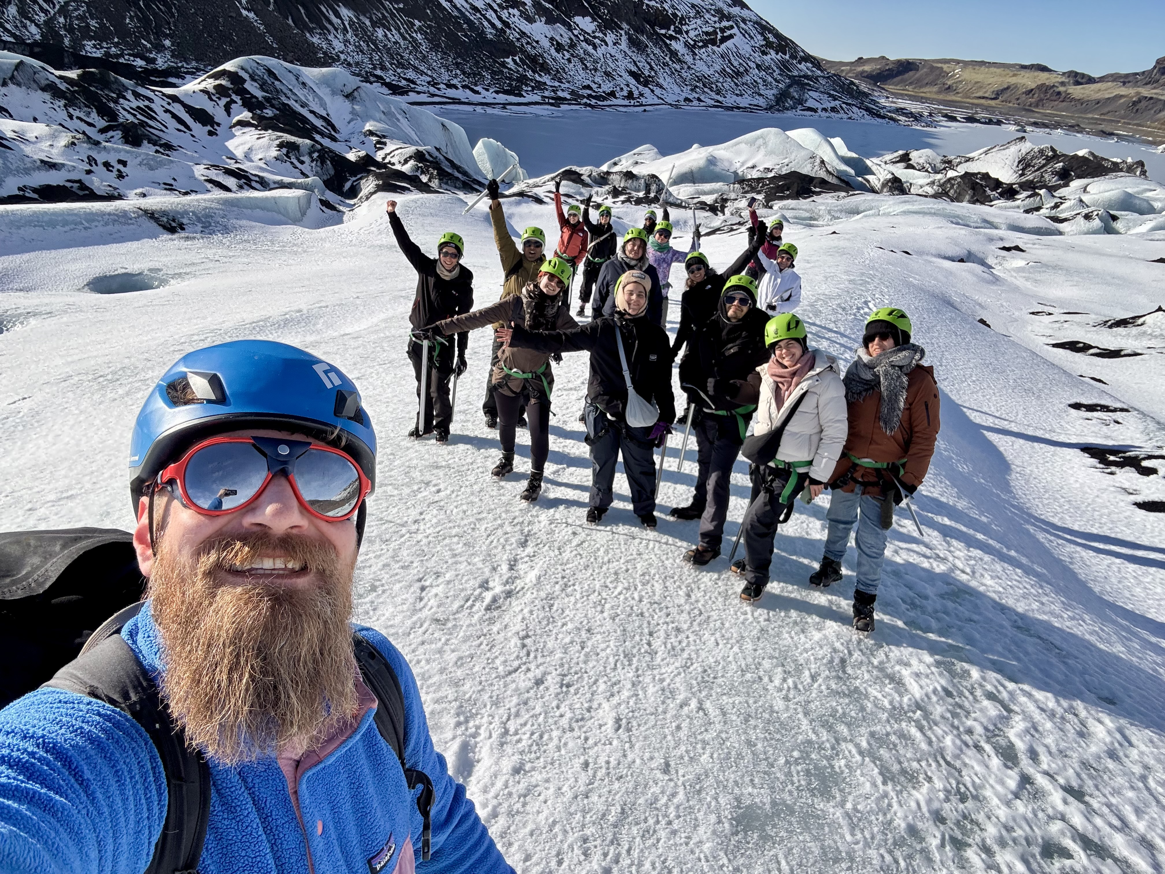 A slightly later start was very welcome after the past few busy days, and we kicked things off with a guided glacier hike at Sólheimajökull. Kitted out with helmets, crampons, and ice axes, we made our way towards the ice, stepping into a landscape that felt straight out of a David Attenborough documentary. Towering ridges, deep crevasses, and endless stretches of ice surrounded us. Walking across the glacier was an incredible experience in itself, but exploring a glowing blue ice cave hidden within it made it feel truly unforgettable.
