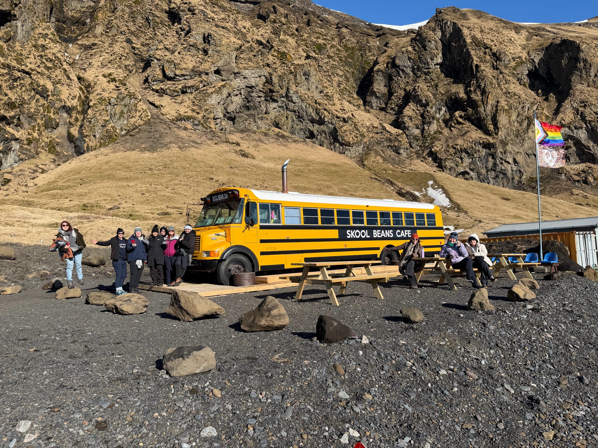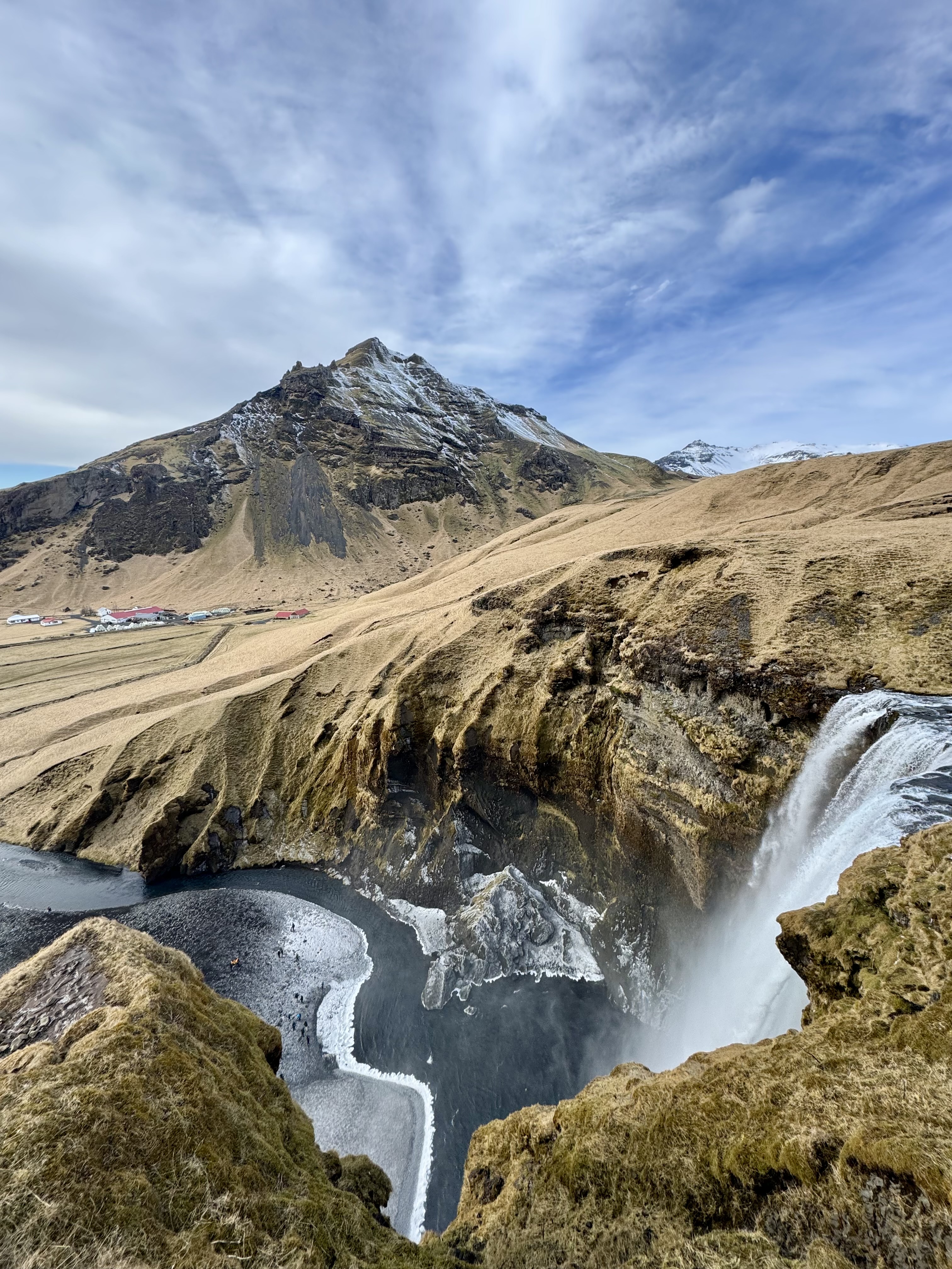 After the hike, a well-earned hot chocolate brought some feeling back into our frozen fingers before we returned to Skógafoss. Seeing the waterfall in daylight after watching the Northern Lights dance above it the night before felt surreal, as if we were visiting a completely different place. Some of the group climbed the steep steps to the top, where sweeping views stretched out towards Eyjafjallajökull, the volcano whose 2010 eruption brought air travel across Europe to a standstill.