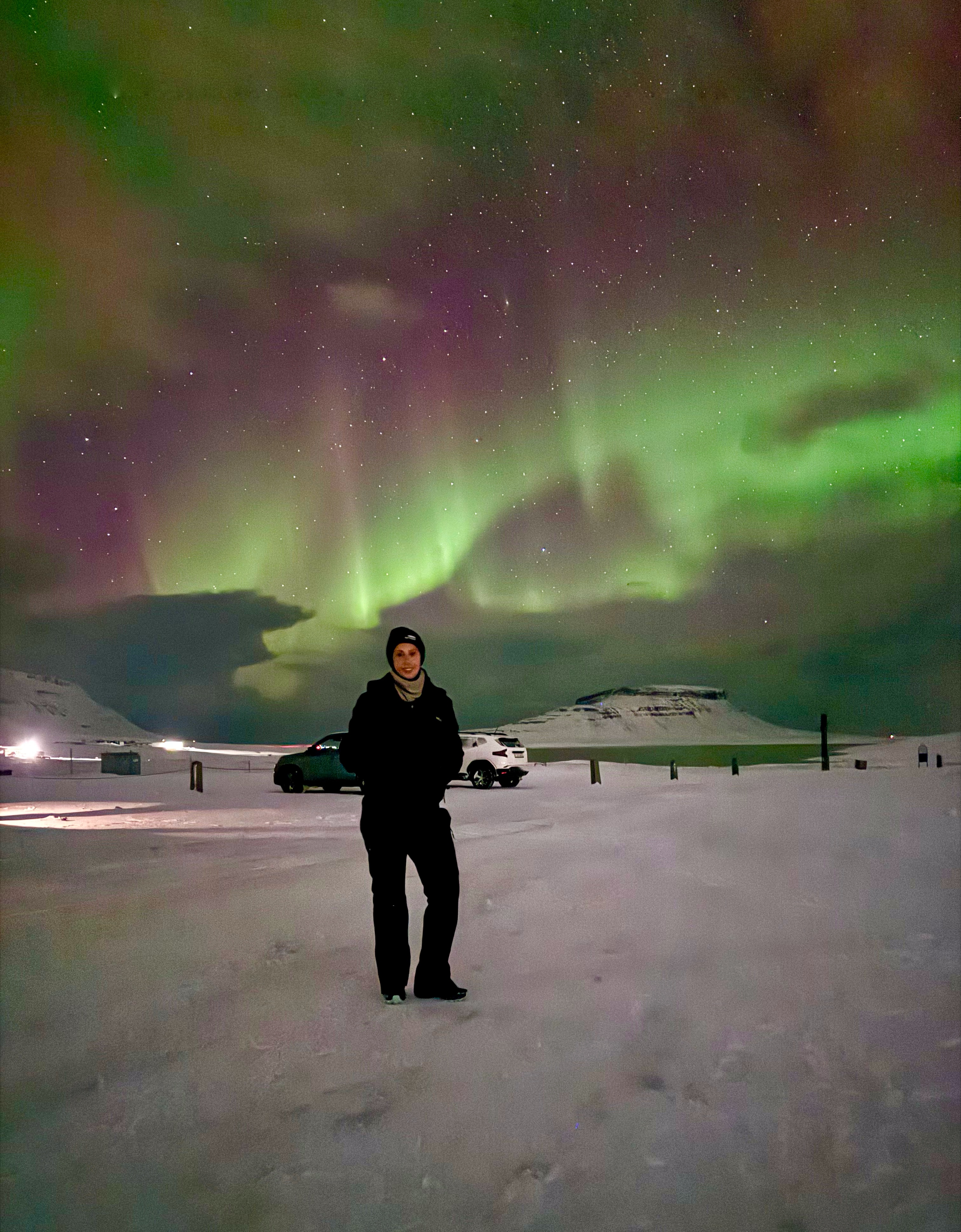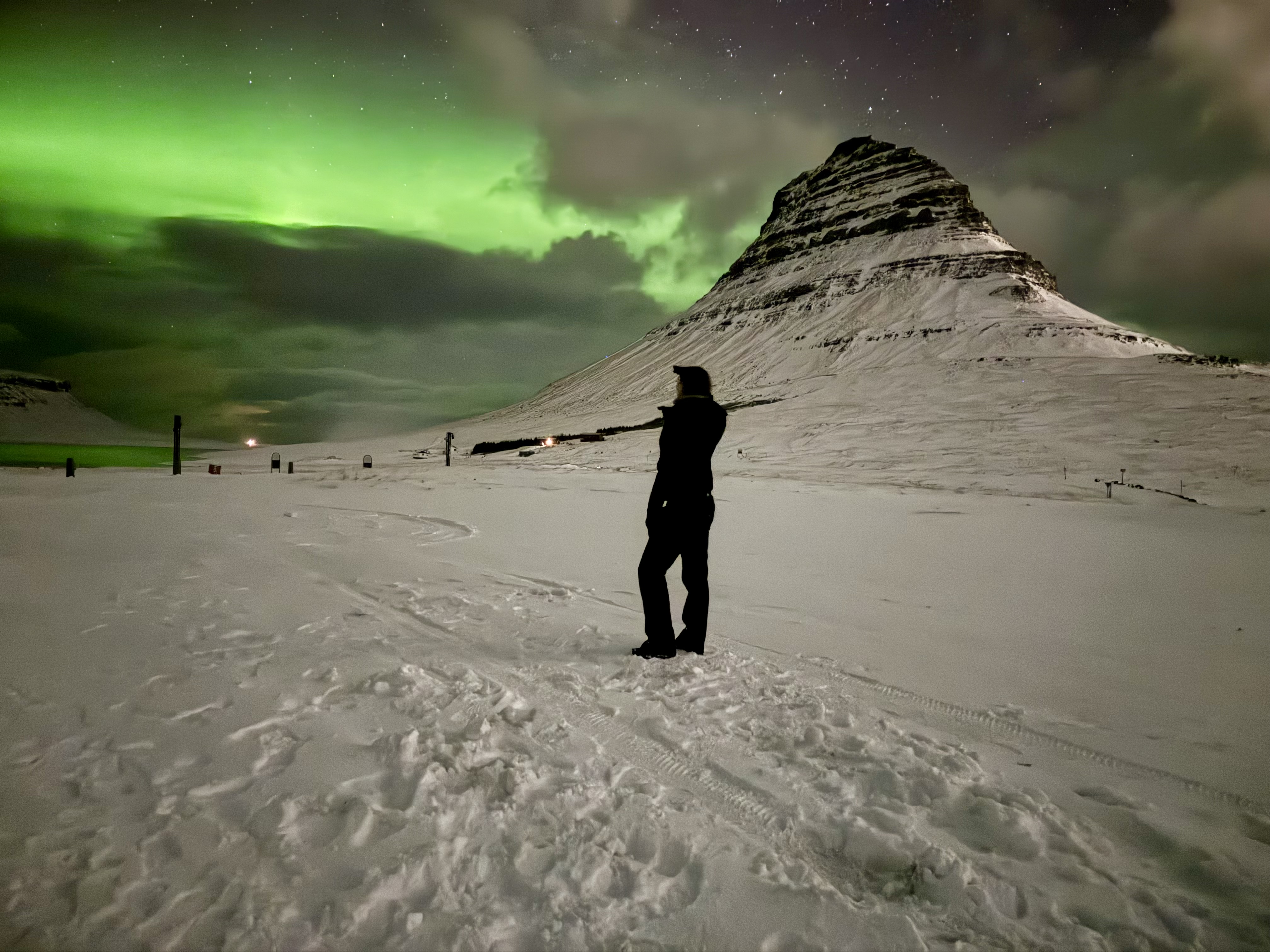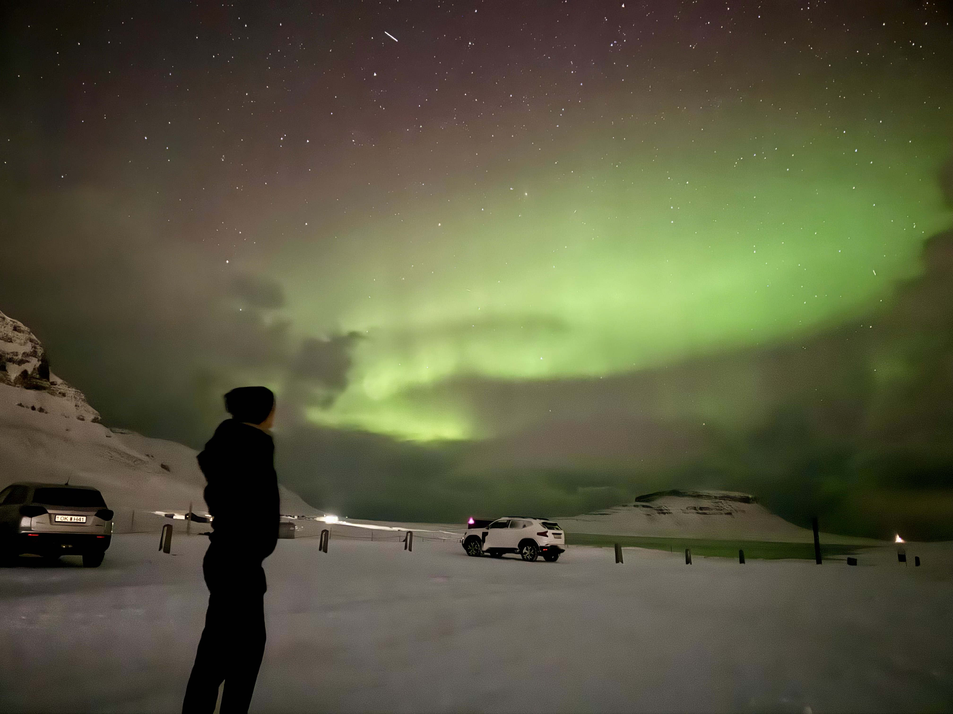 The snow was still falling heavily as we left the hostel just after 10:30pm, and for a moment I wondered if we were completely crazy to be standing in the freezing dark searching for the aurora. The sky was thick with clouds and the wind bit through every layer of clothing. Then, as we drove just five minutes down the road, the clouds suddenly parted and the sky burst into life. Bright ribbons of emerald green began dancing above us, just as Pri, now jokingly known as the “Pri-dictor,” had promised. Seeing the Northern Lights swirling over Kirkjufell mountain on our very first night in Iceland felt completely surreal. We stood there laughing, dancing, and taking photo after photo, hardly able to believe our luck.