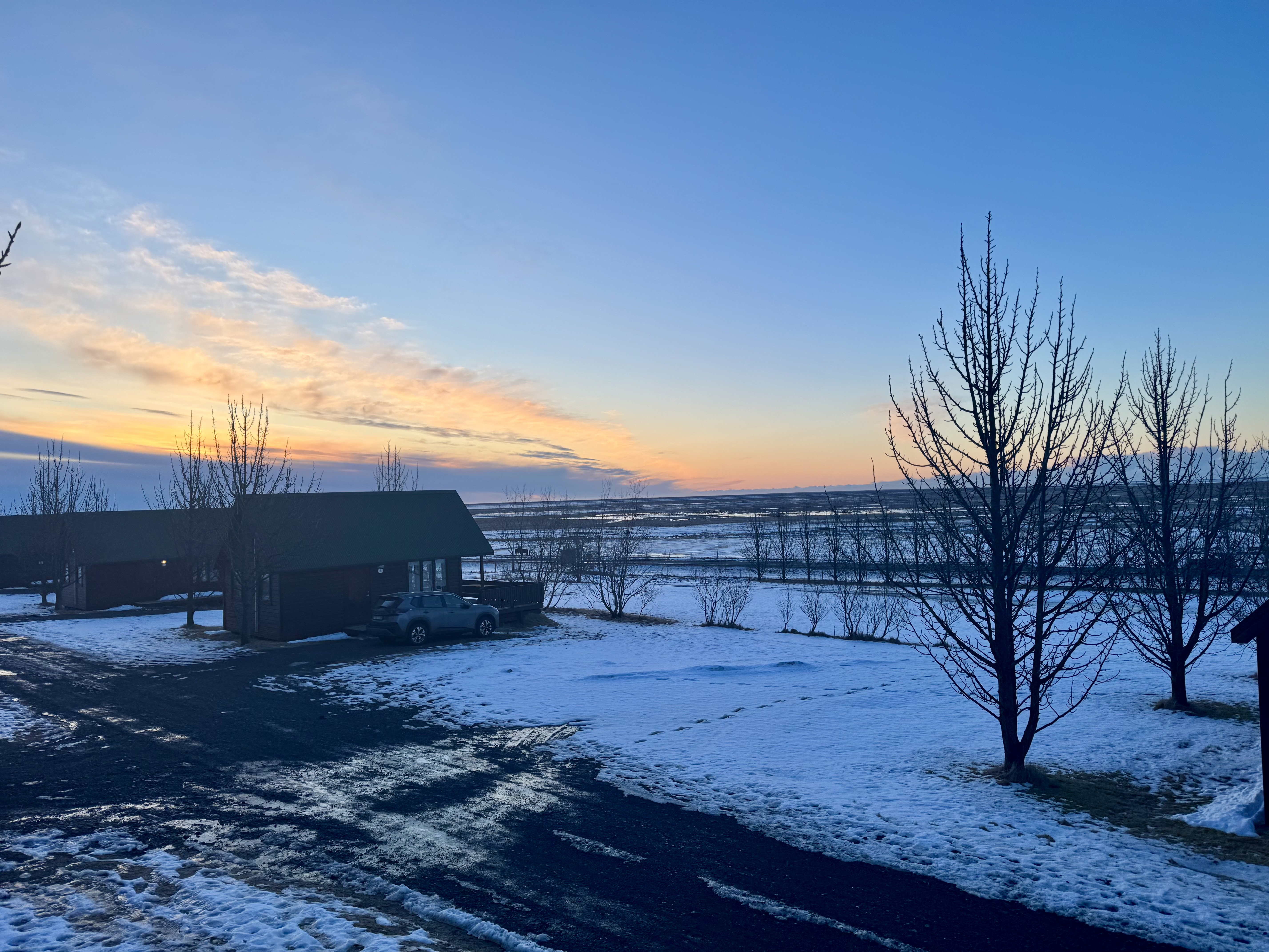 After days of snowstorms and heavy cloud cover, we woke to the most beautiful blue skies and a sunrise spilling across the landscape from our cabins. It felt like Iceland was showing us a another side of itself.
