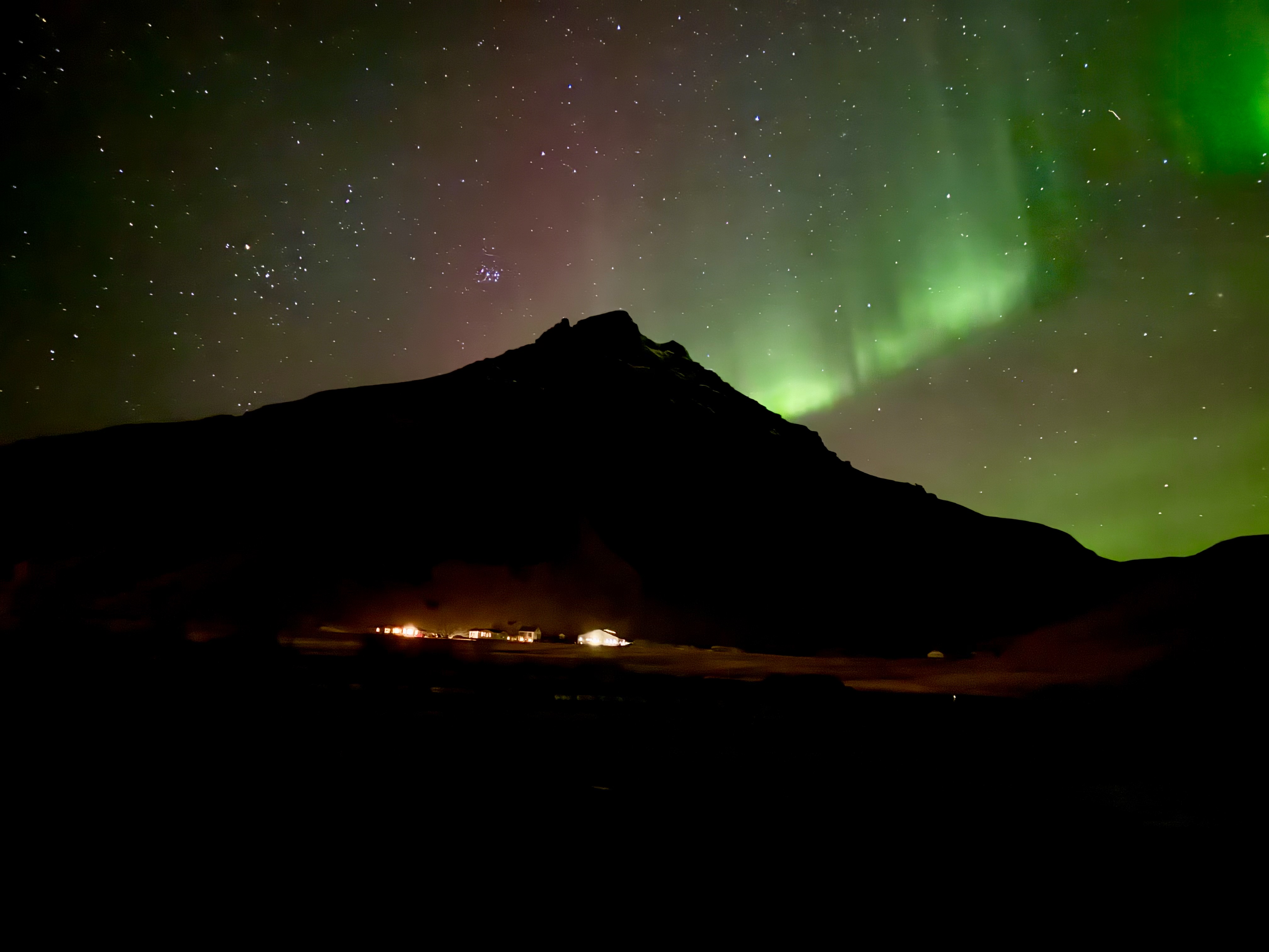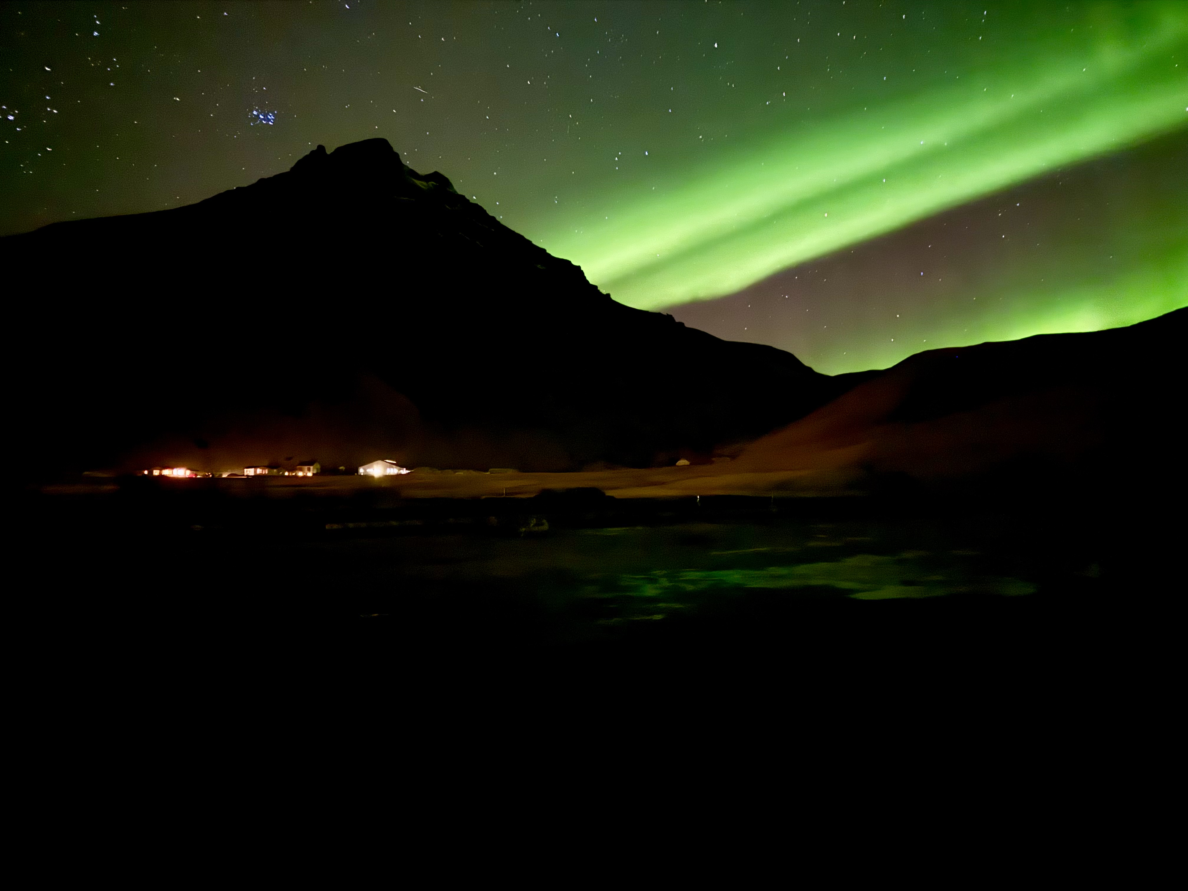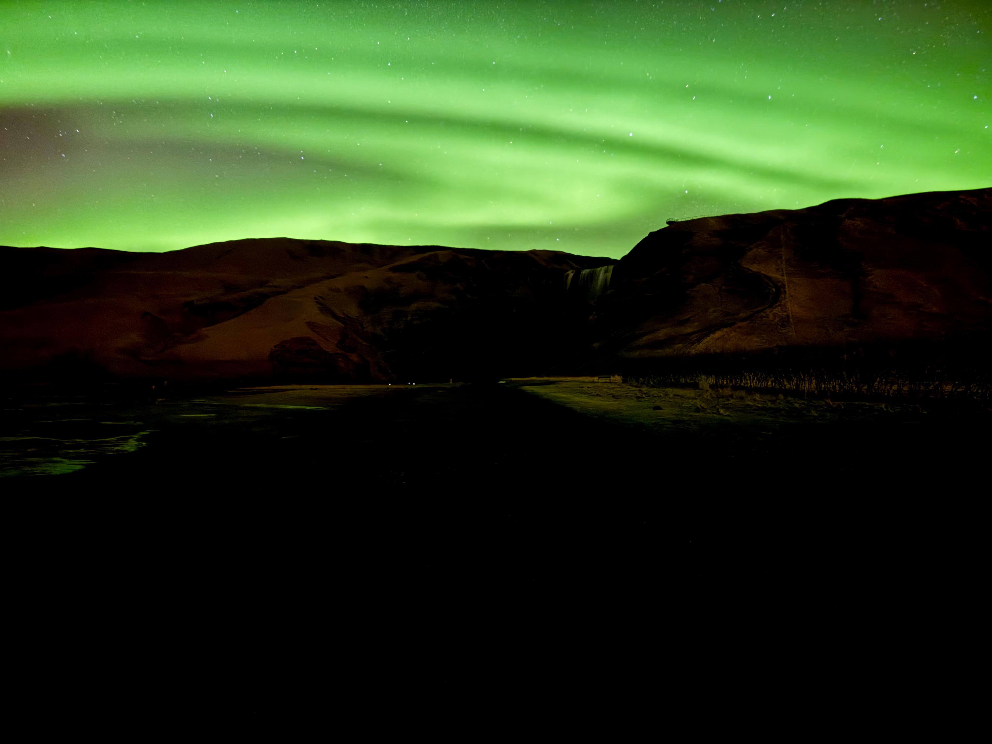 After another delicious home-cooked dinner, we checked the forecast and decided there was a chance of seeing the aurora. We headed to the nearby Skógafoss waterfall and waited under a sky filled with millions of stars. As we waited, Pri took it upon himself to serenade us with Coldplay’s A Sky Full of Stars and Yellow, which made the moment feel even more epic. Slowly, light beams began to appear, signalling the start of the aurora show. Once again, we were completely blown away as emerald skies danced above us, making it another unforgettable night in Iceland.