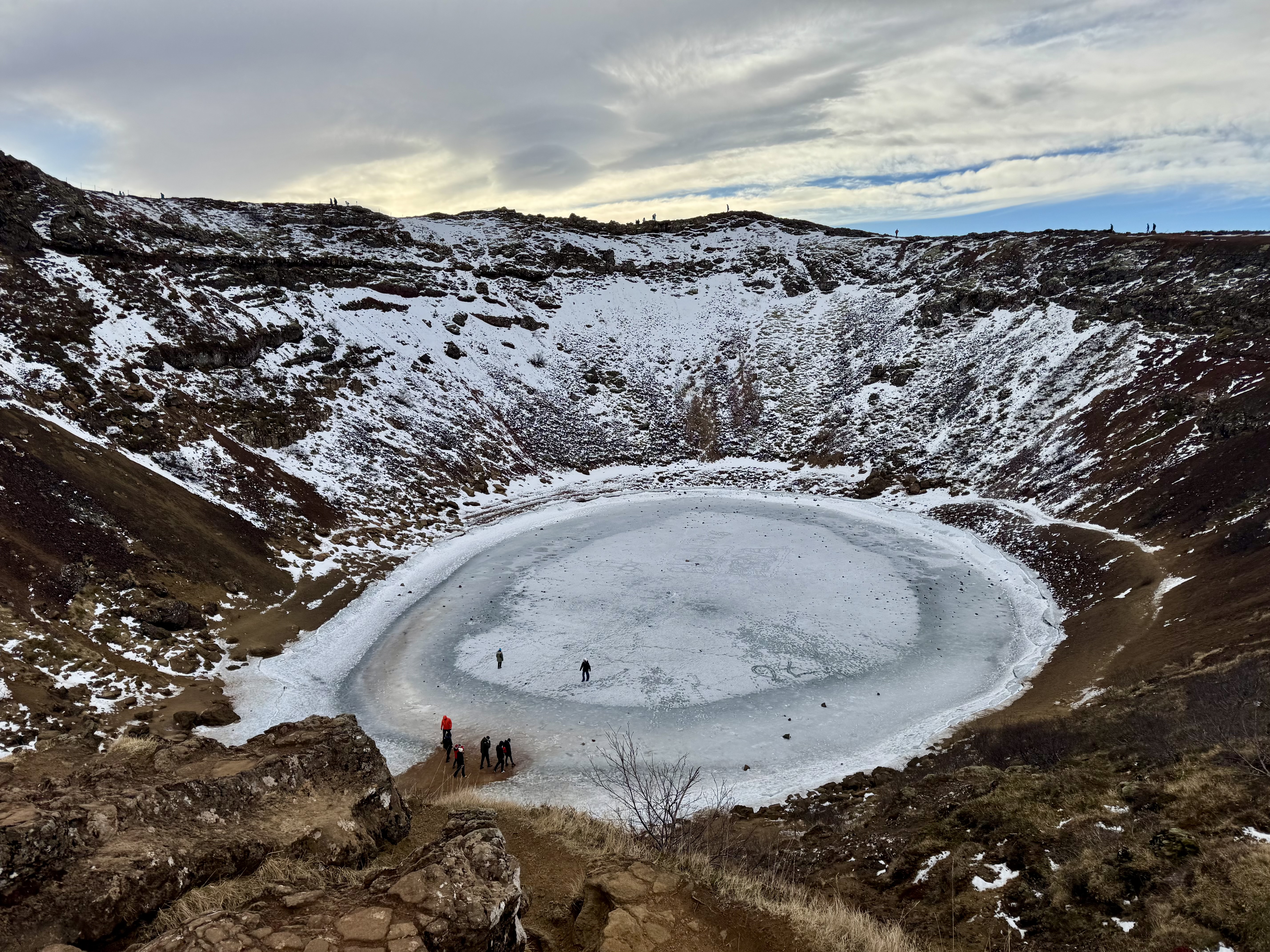 We made a quick stop at Kerið crater, a striking volcanic caldera with deep red slopes surrounding a frozen lake at the bottom. The ice made the crater feel otherworldly, and of course we couldn’t resist carefully making our way down and snapping a few photos for the group collection.